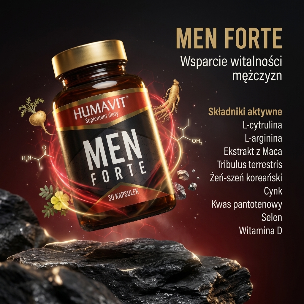 Humavit® MEN FORTE to suplement diety zawierający ekstrakty roślinne takie jak Lepidium meyenii (Maca), Tribulus terrestris, żeń-szeń koreański, a także aminokwasy l-argininę i cytrulinę, witaminy D, kwas pantotenowy, cynk oraz selen. Składniki te wspierają układ krwionośny, witalność i układ odpornościowy.