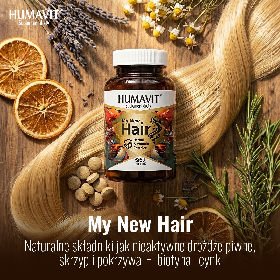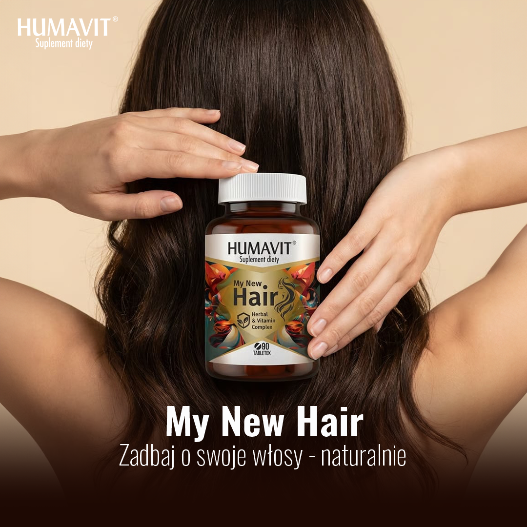 HUMAVIT® MY NEW HAIR to zaawansowana formuła stworzona, aby wesprzeć kondycję włosów, skóry i paznokci. Dzięki starannie dobranym składnikom, takich jak biotyna, cynk, skrzyp polny, pokrzywa i drożdże piwowarskie, produkt pomaga zachować mocne włosy.
